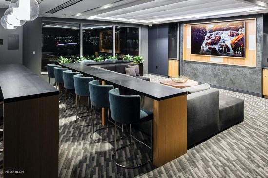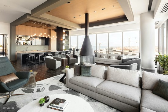 The property’s amenities are primarily located on the seventh and 41st floors. The Level 7 Sky Podium provides a co-working lounge with a media room and conference rooms. Additionally, there is a gym, a yoga room, a dog run, and ample exterior space on this level. The 41st Floor Sky Lounge extends the amenity package and includes a clubroom with a suspended fireplace, an exhibition kitchen, a game room, a barbecue terrace, and a collection of exterior lounge spaces that offer privacy and serenity high atop the city.