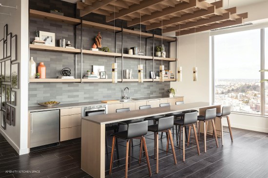 Inside, unit layouts eliminate the use of long, winding hallways to concentrate square footage in the main living areas. Hardwood floors, porcelain tile bathrooms, quartz counters, and European-style appliances come standard, but Nexus buyers can also choose to upgrade to natural stone offerings, as well as the option to extend hardwood floors, add a coordinated furniture island, or purchase an additional parking spot or electric vehicle charger.