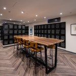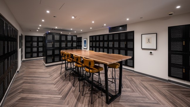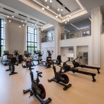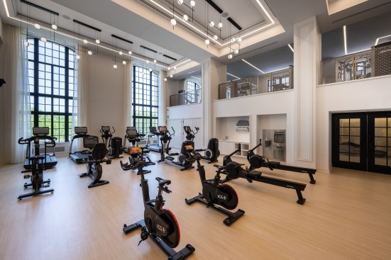 Amenities include a double-height fitness center that once served as the ballroom, a billiards and media lounge, a wine-tasting room, climate-controlled wine storage with individual lockers, reservable conference rooms, and rooftop deck with grilling stations and skyline views.