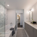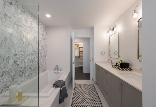 Residential floors were gutted, with the number of units decreasing from 297 to 209. Modern floor plans, including a selection of penthouses with double-height living space, were created. The unit interiors feature modern island kitchens with stainless steel appliances and quartz countertops; walk-in closets; and full-size in-unit washers and dryers. As a historic tax credit project, the double-height lobby was restored to its original glory; the mezzanine level was returned to its original open configuration overlooking the lobby; the façade was restored and historic photos used to recreate a steel and glass canopy crowning the main entrance; and all windows were replaced, with exterior window frames going back to their original blue color.