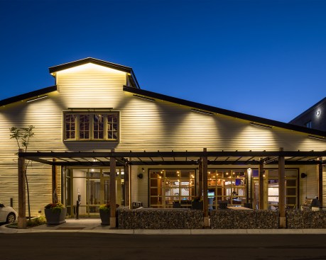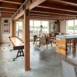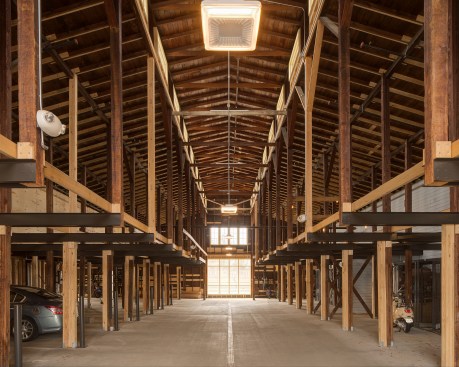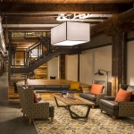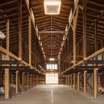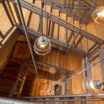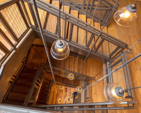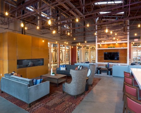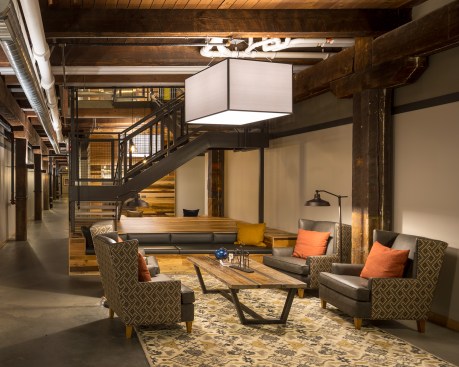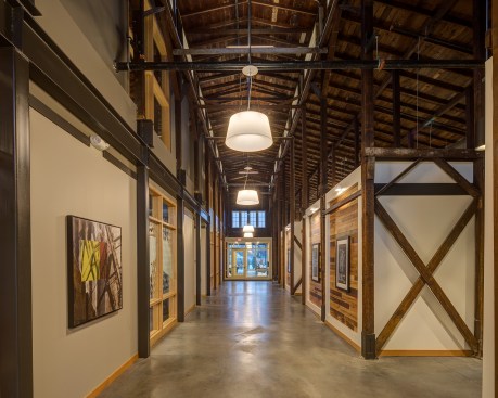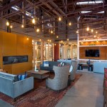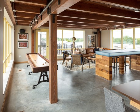 The residential units are arranged in a ring around a central spine in the former warehouse, anchored at one end by a vertical connecting stair and at the other by the original elevator shaft, now a light well with original structures as design elements. One of the lumber sheds now houses a large community room with a fireplace, a fitness room and yoga studio, and the leasing office, while another has been converted into a parking garage and storage space with exposed tongue-and-groove ceilings and supports. A smaller clubhouse and patio are located on the roof.