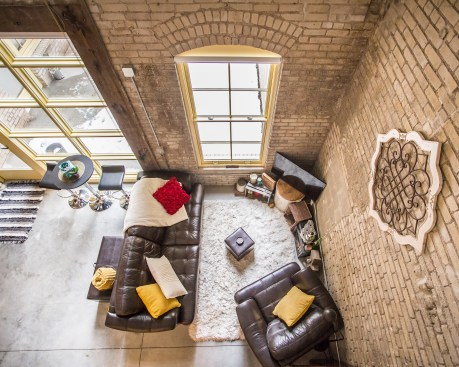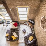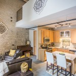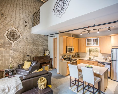 The amenity spaces and unit floor plans are designed around the millworks’ existing structures, including original windows and window openings, weathered brick walls, and timber support columns. The one-, two-, and three-bedroom lofts in the warehouse feature 12-foot ceilings, while the cold-storage spaces feature prominent tongue-and-groove ceiling structures.
