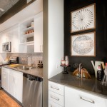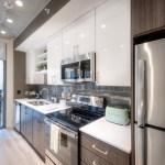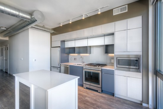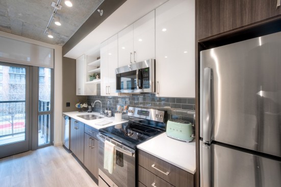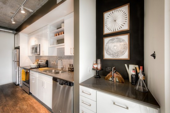 Industrial features are balanced with modern accents such as space-saving, sliding barn doors and open shelving. In the kitchens, the sleek finishes continue with glass backsplashes, stainless steel appliances and fixtures, and quartz countertops.