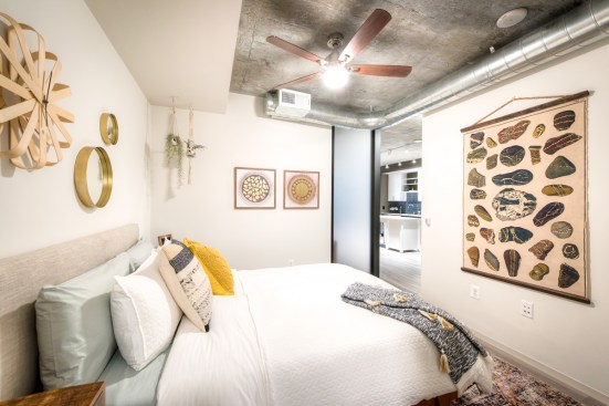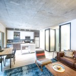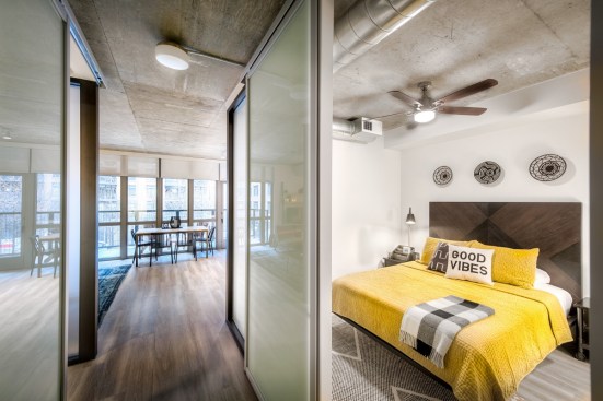 In order to maximize the natural light in each of the unit’s living areas, the apartments include “buried bedrooms,” or rooms without windows. But to make each of the bedrooms feel brighter, the team installed store-front glass in the bedroom corners and cut out wall sections along the ceiling to bring in more light. Both solutions also enhance the building’s industrial vibe.