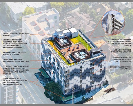 “With so many of Cove’s sustainable elements visible from the exterior—green awnings, bamboo ground-floor cladding, south-hanging solar panels—prospective renters can immediately identify Cove as in sync with their green values,” says the architecture firm. “To tenants [the building’s LEED status] translates not only to living out their values, but also to significant energy savings. They appreciate seeing lower energy bills than they’ve seen elsewhere, just as they appreciate being able to walk to work, the store, or the cultural attractions in the neighborhood.”