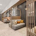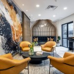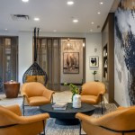 Each amenity space features its own unique design element, yet the cohesive use of color, textures, and patterns ensures a unified aesthetic throughout aimed to capture a relaxed lakeside atmosphere with a touch of refinement.