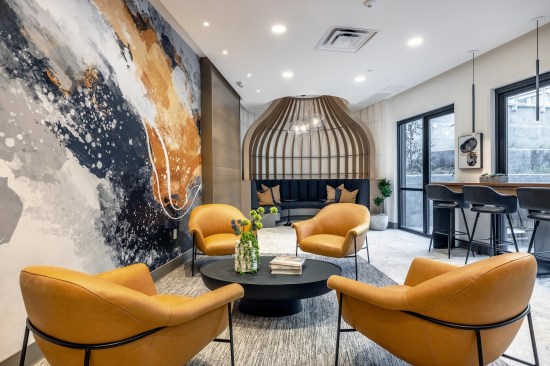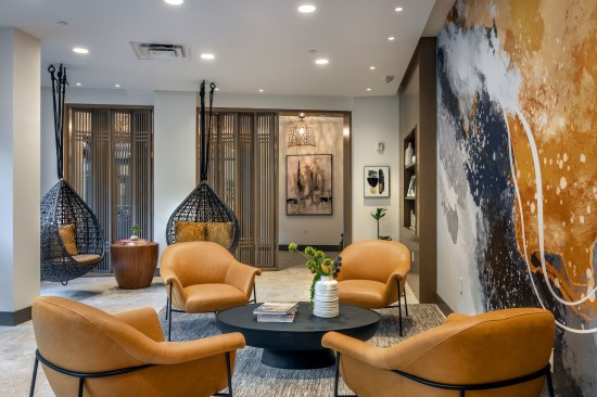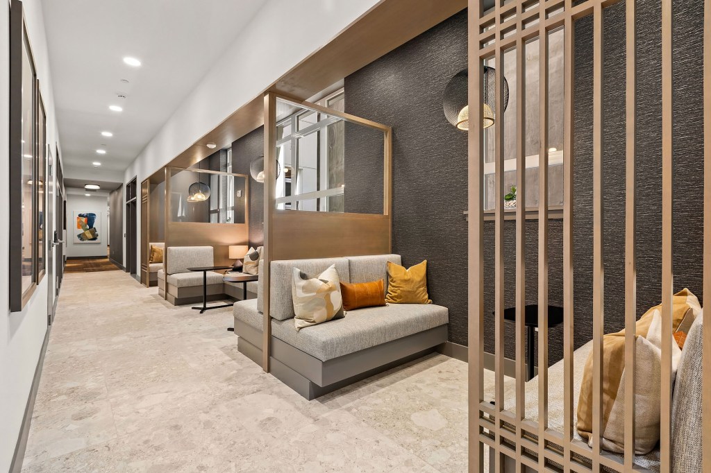 In the work-from-home area, the design concept includes an abstract wood bird cage seating area along with woven hanging chairs. The team carved out small open study nooks that can be used for a coffee meetup or a place for private focused work. A small conference room provides residents with a remote workplace for virtual meetings as well.
