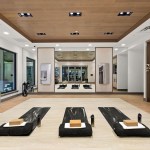 Adjacent to the fitness center is a tranquil yoga room with a wood ceiling and acoustical wood floor, featuring custom casework for yoga mats and balancing blocks. Two interactive mirrors integrated with the full-sized mirror wall offer personalized workout sessions.