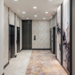 The integration of old and new resulted in irregularly shaped spaces on the amenity levels and throughout the building. Triangular corners, asymmetrical layouts, and necessary expansion joints presented a unique opportunity to design smaller, individual amenity spaces.