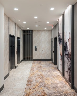 As a result, the amenity areas are divided into distinct zones: work from home, communal gathering, and wellness. The elevator lobby, which showcases custom wall panels with wood screens, serves as the central delineation between these spaces, guiding residents to their desired destination.