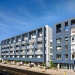 To maximize the impact of the unique infill site—two lots with an alley running between them—the architects designed three buildings connected by a pedestrian bridge that crosses over the alley and a large courtyard in the center of the community.