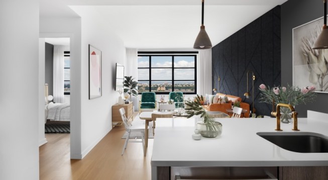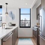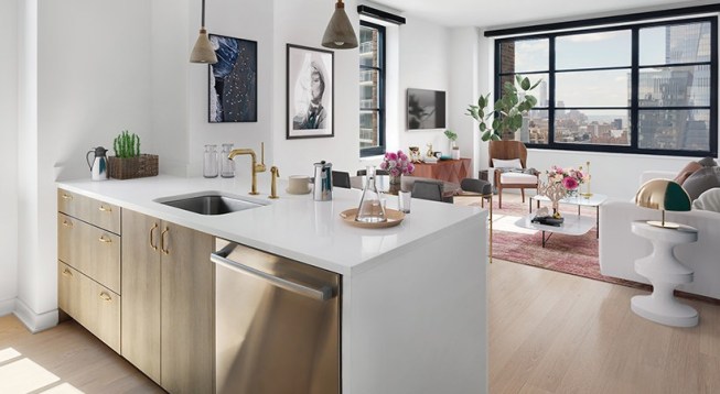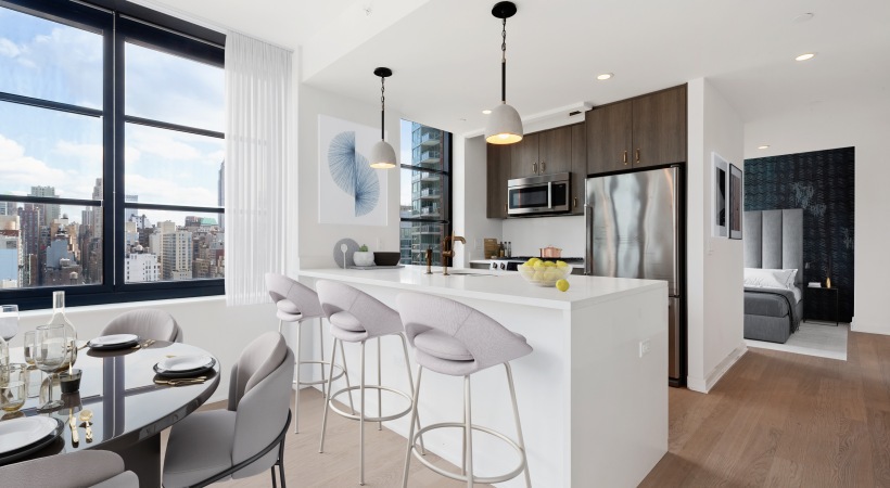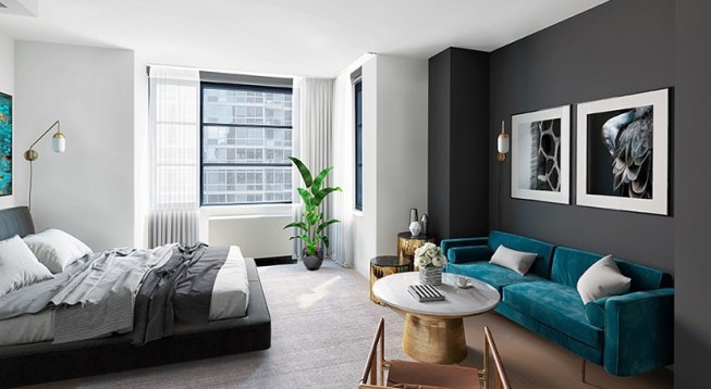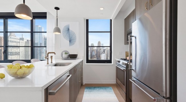 Building amenities include a work-from-home lounge, a chef’s kitchen, a fitness center, a dining room for private parties, a complimentary candy bar, and room service. There’s also a landscaped terrace with views of the Empire State Building and the Hudson River. The building and units were outfitted with young business professionals and millennials in mind.