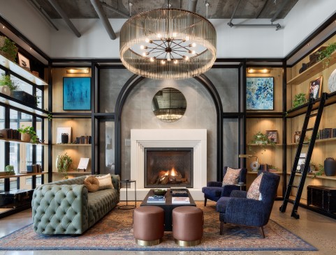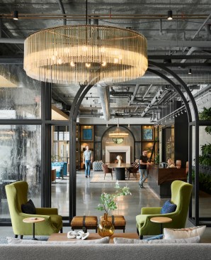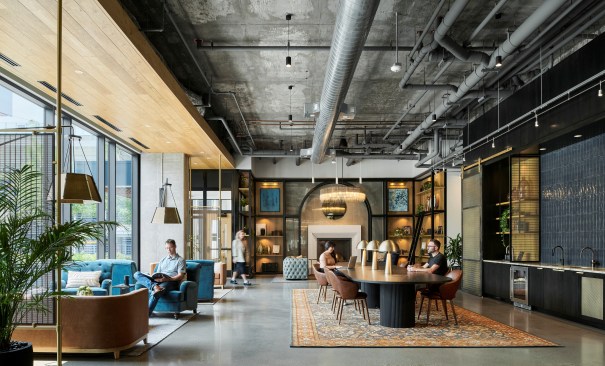 A sky bridge connects the adjacent office tower where the 14th floor hosts shared amenities and a 360-degree view of Minneapolis, including into the Minnesota Twins’ baseball stadium, Target Field, located next to North Loop Green.