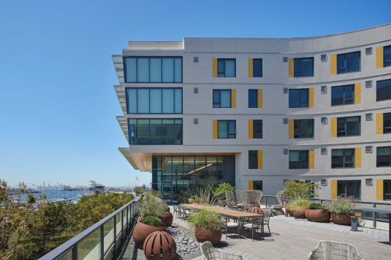 Amenity spaces leverage the building’s waterfront location. On the fourth floor, indoor and outdoor spaces flow together seamlessly and offer views of the adjacent harbor and the Port of Oakland’s iconic cranes. Indoor amenities include lounges, shared and private workspaces, and a fitness center. Outside, residents can relax in a series of sheltered courtyards or a large, elevated terrace for al fresco dining and gathering.