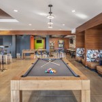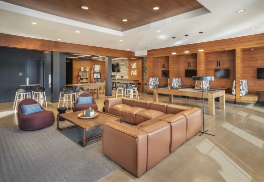 The centrally located 24-hour clubhouse offers students quiet space to study or work on group projects in private rooms with smart boards, computers, and unlimited printing. Two separate bar areas provide bottomless coffee and seltzer. Lower-level lounge spaces are the perfect spot for college game day viewing and video games, while the 3,900-square-foot fitness center has cardio machines connected to the internet and TV, a free weight section, and an immersive fitness area for on-demand classes. Additional amenities include a half-court basketball court, a rock-climbing wall, a sauna, and a spray-tan booth. Outside, students have access to a resort-style pool, three hot tubs, in-pool lounge seating, grills, fire pits, and hammocks.