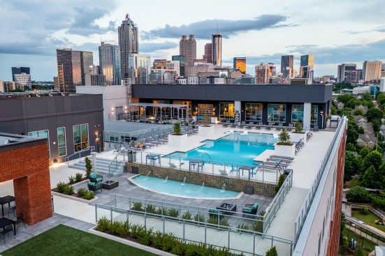 Layered amenities follow the natural grade of the 3.5-acre site peaking with a rooftop pool and 360-degree views of Atlanta. Inside, residents access the building at the lower end and travel through various study spaces to a striking staircase that leads to reception and leasing. While amenities continue to cascade throughout the building, there’s a separation of academic and social spaces, allowing for a quieter area for focus when needed and areas to connect with friends and neighbors. On every level, study pods are also available near the resident elevators.