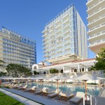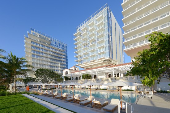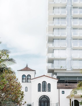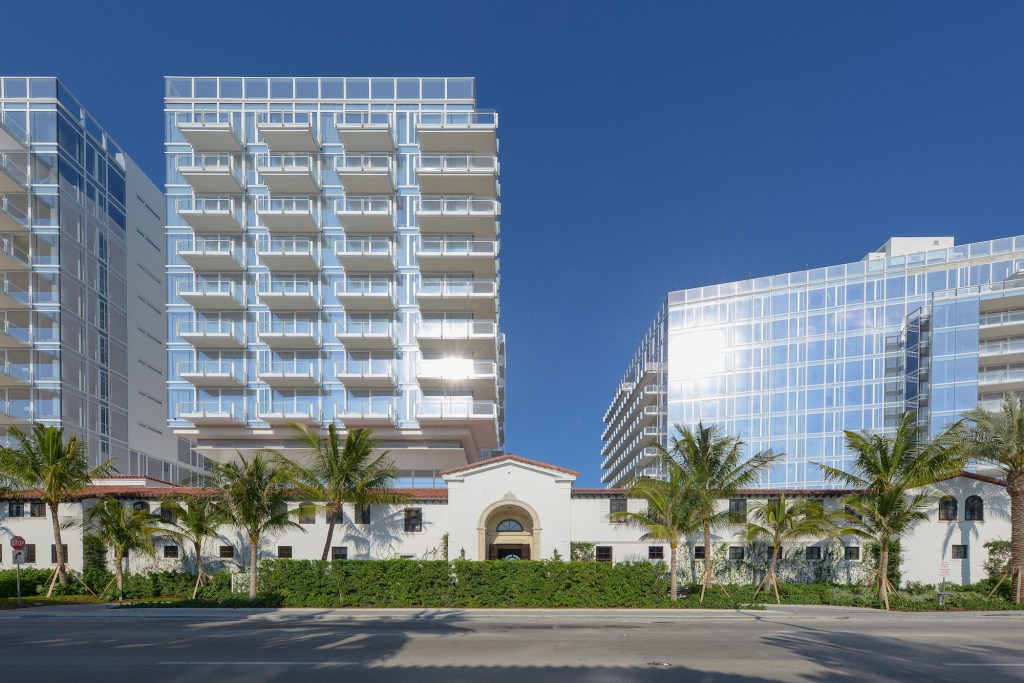 The old and new harmonizes, with the historical building framed by newly constructed glass towers. A new 77-room hotel tower floats over the historical courtyard in the center, creating a four-story indoor glass atrium. The former Surf Club serves as the hotel lobby, lounge, library, bar, restaurant, ballroom, and other public spaces. The club area and cantilevered hotel are centerpieces between two 12-story luxury glass condo towers.