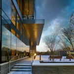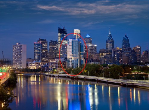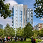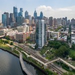 The modern glass-and-steel tower, designed by Cecil Baker + Partners, is located in Center City by the edge of the Schuylkill River. Its reflective glass highlights the blues and greens of the Fitler Square park area, and its slim proportions and underground garage leave a minimal footprint.