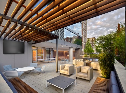 Outdoor spaces were another main component to the project. With many residents moving in from the suburbs, the team wanted to provide them with ample open space and outdoor areas. A large landscaped garden, a ground-level terrace with an outdoor kitchen, a grill and fire pit overlooking a rain garden, and a sundeck were all included in the building’s design.