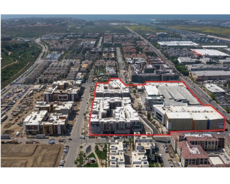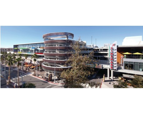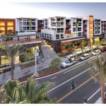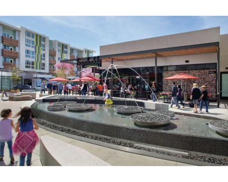 A large parking structure separates the two anchors—a Whole Foods grocery in one and a CVS/Pharmacy and movie complex in the other. Nearby, other structures house three floors of residential units as well as townhouses, offering a sense of intimacy within the whole.