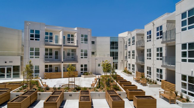 The four-story building includes laundry, a computer room, and community rooms along with a large outdoor courtyard with community gardens at the second floor, an outdoor terrace at the fourth floor, and living roofs with pollinator gardens. Taking cues from lessons learned on a prior project, the team added pet relief and dog wash stations to accommodate residents’ pets, which have been especially important for seniors and people experiencing homelessness.The project, which features photovoltaic panels to power the building’s common areas, is designed to meet LEED Platinum standards and is a pilot for the Healthy Building Network’s HomeFree Initiative, which seeks to improve the health of affordable housing residents by using healthier building materials.
