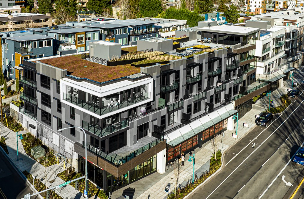 Developed by Henbart, Parque Kirkland is a 70-unit, four-story apartment building with retail and a restaurant at ground level and two levels of below-grade parking. Architect Graphite Design Group sought to keep the project, on a site measuring the length of a football field, “human scaled” so as to not overwhelm the pedestrian experience.