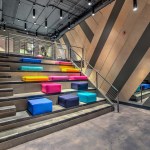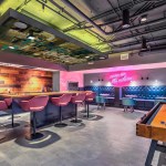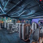 The team drew inspiration from high-end, boutique fitness centers and night clubs and designed the space to be dramatic and full of energy. Featuring a geometric screen wall that folds onto the ceiling, exposed concrete floors, reclaimed wood, graphic metallic wall coverings, large-scale porcelain slabs, and acoustic wood wool panels, the center’s aesthetic appeal aligned with the modern and savvy demographic that the property wanted to attract. Additionally, the space was updated with new equipment, increased square footage and floor space, and improved accessibility.