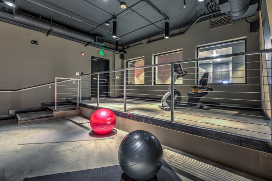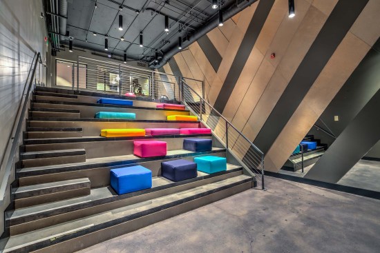 By expanding the overall square footage, the team was able to incorporate additional fitness-related areas within or adjacent to the center including a rock climbing wall, a multilevel amphitheater space, a hospitality lounge, and market with healthy vending and towel service. The amphitheater space, in particular, is a flexible space that offers spin, yoga, fitness on-demand, and the ability to be used as a theater for special events.