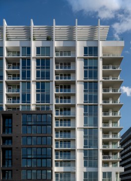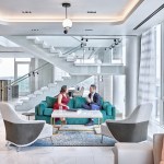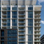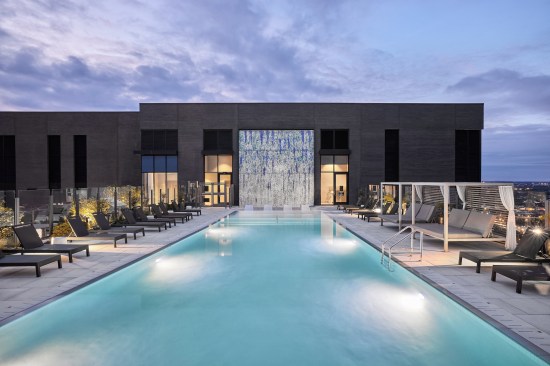 Anchored by a charcoal color inkspot Norman brick base, the exterior of the Pierce becomes lighter toward the upper floors, culminating with a glass and metal volume Hickok Cole calls “The Lantern,” a feature designed to be visible from afar. To maximize area density, the Pierce and its neighboring apartment tower are combined in some areas, with residents at both buildings having access to a landscaped rooftop and a 65-foot resort-style pool with a custom waterfall feature.