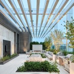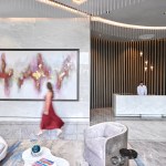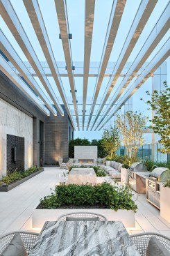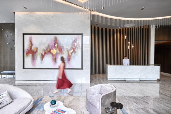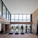 Throughout the public spaces, floor-to-ceiling windows highlight the art pieces, which are surrounded by neutral finishes. Each unit in the Pierce also features floor-to-ceiling windows, hand-scraped hickory flooring, European lacquered kitchen cabinets with built-in wine refrigerators, and under-cabinet lighting. The bathroom suites feature gray European marble counters, illuminated mirrors, tiled glass enclosed showers, and white lacquered vanities. Select units feature private access elevators.