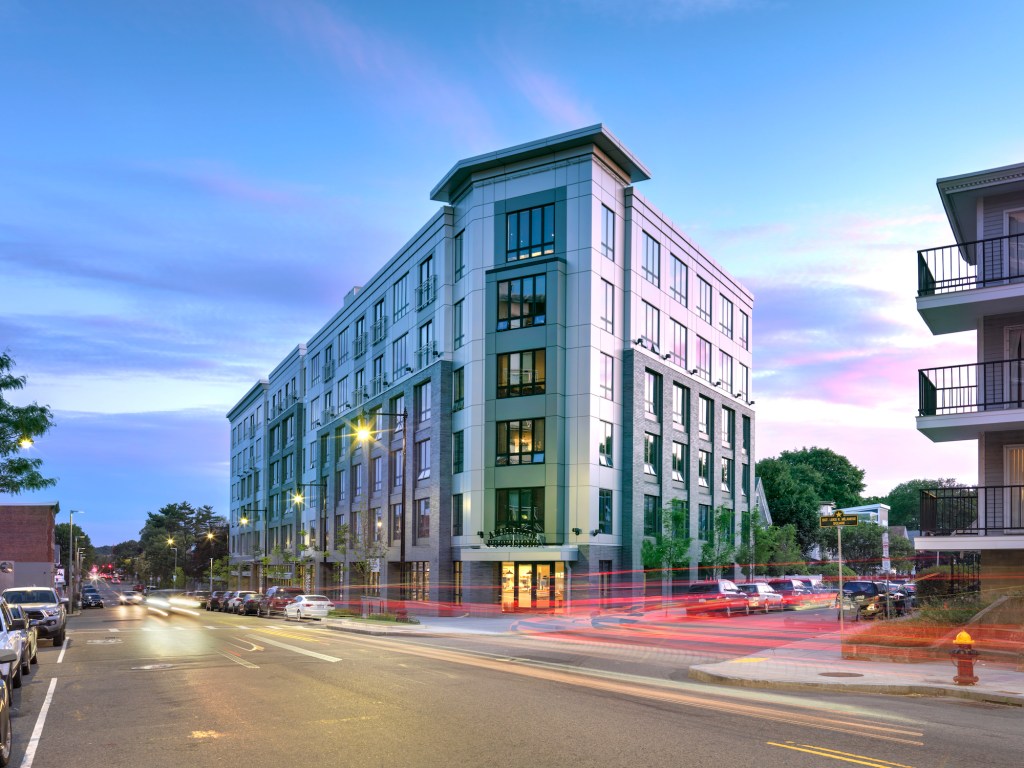 The development gets its name and inspiration from the Ashmont Tire Co., which occupied the location for more than 50 years. The design incorporates subtle nuances of the automotive industry with sculptural headlight sconces, modern wall art made from reclaimed tires, and a chandelier custom designed to mimic the shape of a tire frame, according to The Architectural Team.
