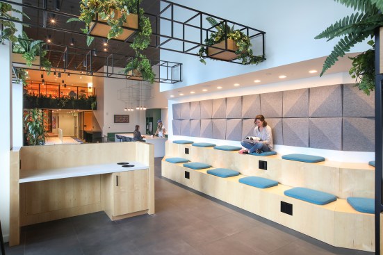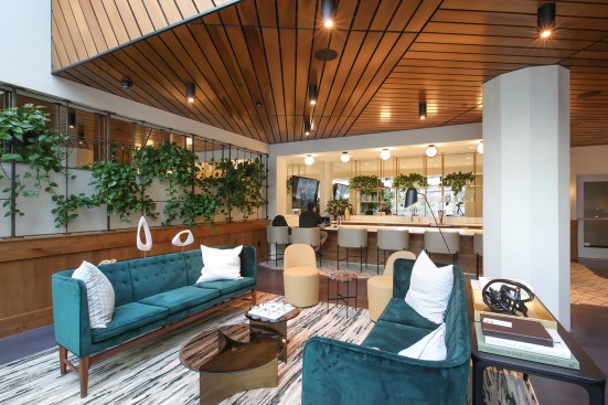 Interior designer House of Honey outfitted the project’s common areas with a sophisticated palette of neutral textures, subtle green accents, warm natural woods, leathers, and geometric furniture, “creating a streamlined, high-end, futuristic vibe to this upscale property.”