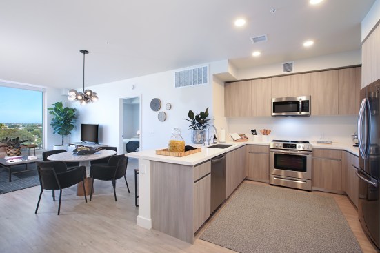 Offering a wide range of unit types, from studio apartments to three-bedroom homes, the development houses young professionals and families alike. The units were designed with flexible layouts, creating space for living, work/study, and dining. Floor-to-ceiling windows with roll-down shades flood units with natural light, while recessed lighting and neutral luxury vinyl plank flooring keep the rooms feeling bright and open.