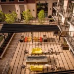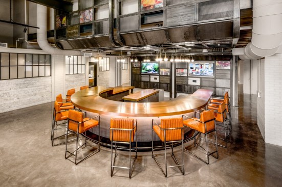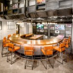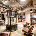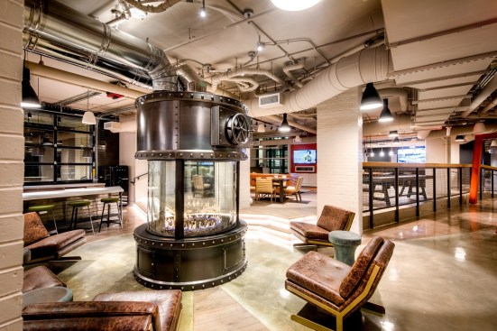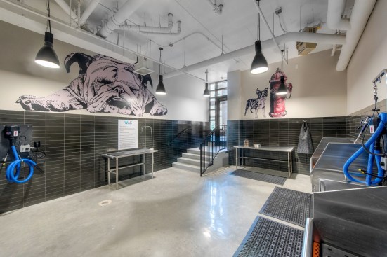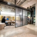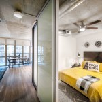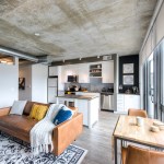 Inside the apartments, residents can customize their personal space, but the overall industrial features flow into the spaces as well. Concrete columns, exposed ductwork, and chalkboard walls accent the modern details of stainless steel appliances, quartz counters, and barn doors.