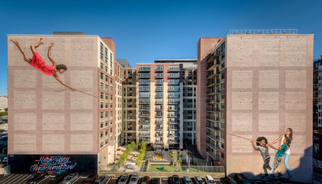 A series of murals on the façade also make the building stand out. Developer AvalonBay Communities participated in a local mural festival, Pow! Wow! D.C., in which two murals were painted on the building. Then, the company commissioned another local artist for a much larger mural featuring subjects from the neighborhood.