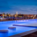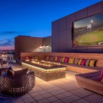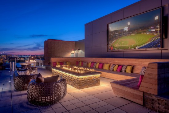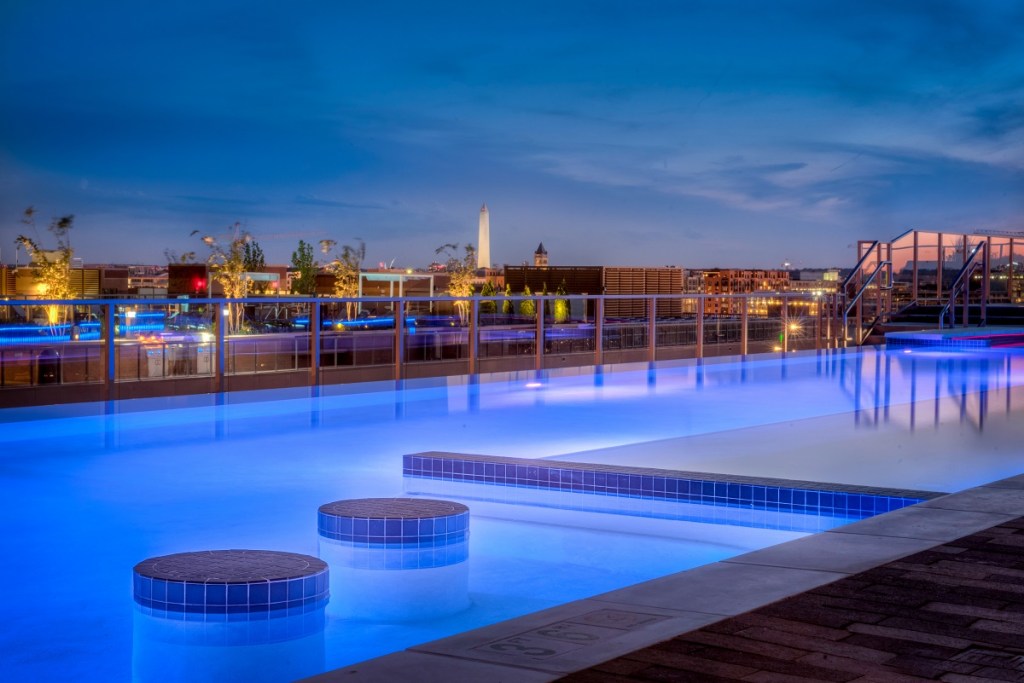 The roof offers views of the nearby national monuments and items that encourage social interaction, such as comfortable spaces to gather and play games, a 16-by-8-foot big-screen television, an infinity-edge pool, an entertainment kitchen, and an indoor–outdoor lounge. Renters can host happy hours and game-time gatherings to watch sports as well as enjoy an opportunity to mingle with their fellow residents.