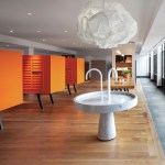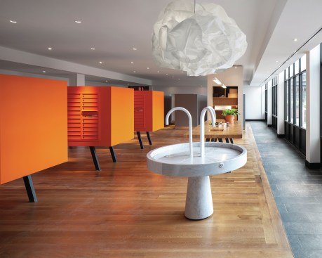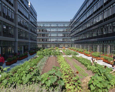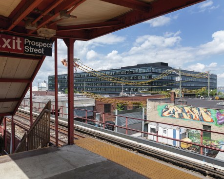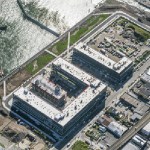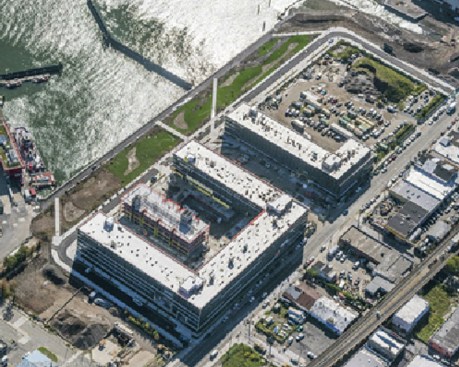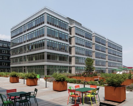 The two buildings of four and five stories each surround Navy Pier Court, a private drive between the buildings with two 10-foot-wide, tree-lined sidewalks, bordered by seating and plantings. The project’s buildings, which are designed with metal, glass, and Corten steel in a nod to the site’s past as a warehouse district, sit in two large “U” shapes around the landscaped area, which provides views of Lower Manhattan, Brooklyn, the Verrazano Bridge, and New York’s Upper Bay.