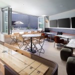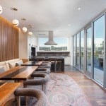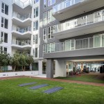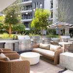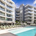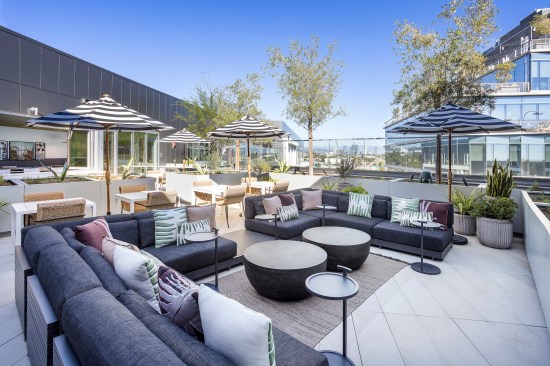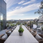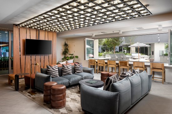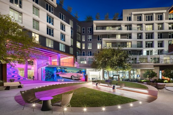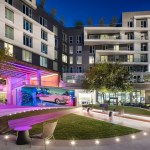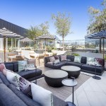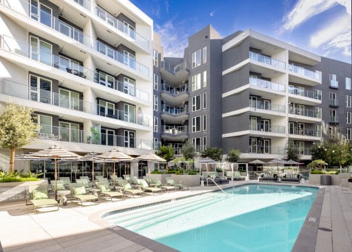 The social amenities in the apartment complex provide residents with a retreat-like atmosphere with a “California vibe,” including a pool lounge, a private dining terrace, and co-working space. The apartments, which include 120 income-restricted units, prioritize light and panoramic views with floor-to-ceiling glass; 30% of the units feature balconies.