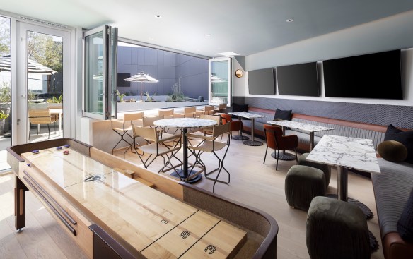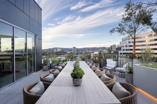 “[The Martin family Cadillac dealership] was a landmark, so we drew on that; because the Martin family was our partner, we wanted them and their family history to have a mark on the project,” West Edge project manager Matthew Hines of developer Hines says. “Some of the seating elements that we have in the plaza have a glossy paint finish and use the same colors from classic Cadillacs. We have pictures throughout [the interior] and in the elevators. It pays homage to that history while representing the Westside of LA and the Westside culture.”