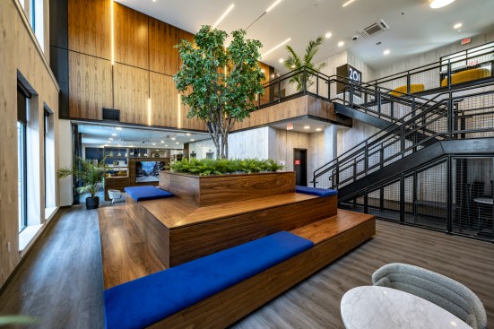 Apartments feature floor-to-ceiling windows, vinyl plank flooring, stackable washers and dryers, and walk-in master closets. Kitchens and bathrooms include quartz worktops, white ceramic tile backsplashes, gray Shaker-style cabinets, stainless steel Energy Star appliances, and WaterSense plumbing fixtures. The development also includes an Amazon Hub system, a fitness center, a resident lounge, a dog grooming area, an outdoor dog park, and playful touches like a 17-foot tree in the lobby.
