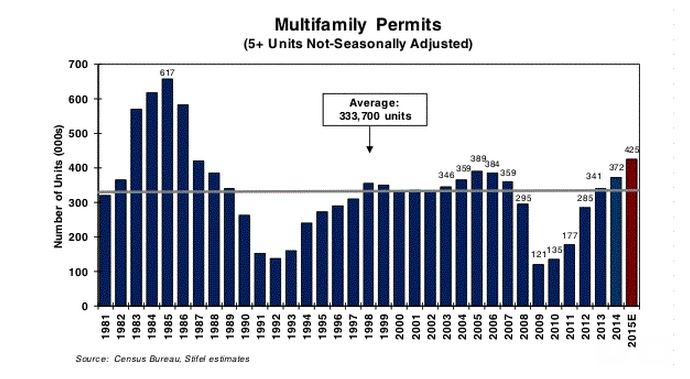 Stifel Nicolaus’ Rod Petrik pointed out that on a trailing 12-month basis, five-unit-plus permits came in 18.8% year-over-year with permits sitting 29.0% above the 30-year average.