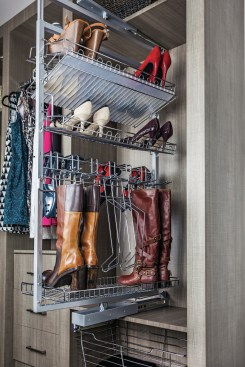 Hardware Resources’ Revolving Boot and Shoe Rack is a 28-inch-wide rack that pulls out of the closet and pivots 180 degrees, allowing easy access to every pair of shoes and featuring the ability to store twice as many shoes as traditional racks. The system is available in four, eight, or 12 shelves, in either a white powder-coat or silver powder-coat frame and chrome shelving, or a 61-inch-high revolving rack that holds more than 20 pairs of footwear in silver powder-coat frame and chrome shelving. Optional plastic liners help keep shoes and boots clean.