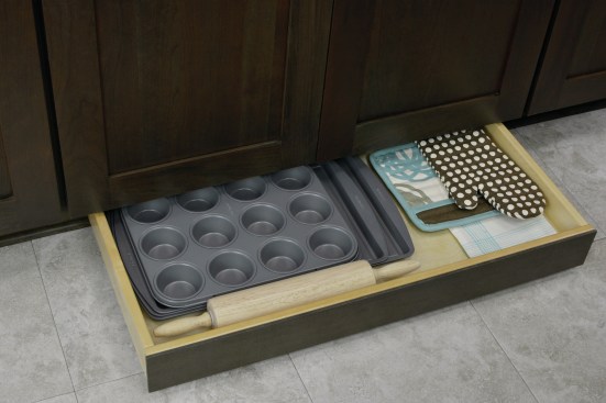 The Toe Space Drawer from Dura Supreme Cabinetry increases kitchen cabinet storage by utilizing a space that is commonly forgotten. Fitted along the bottom of any straight 18-, 21-, or 24-inch cabinet, the extra drawer increases storage without adding more square footage to the kitchen. The touch-latch mechanism allows users to open the drawer with the touch of their foot, eliminating knobs or handles.