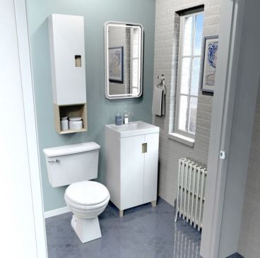 The Aravo line by bathroom furnishing manufacturer Ronbow is a collection of fixtures designed for a small bathroom. The Petite collection measures 18 inches wide by 14 inches deep, and each vanity has extra shelves or drawers installed for added storage, and includes other elements like an LED mirror with a frame of illumination surrounding it, a hairdryer holder, and a side-door storage to maximize usage of space. A ceramic sinktop fits on top of the Petite vanity, and the sink features a geometric beveled shape with a removable drain cover that is integrated into the floor of the sink, which creates the illusion that the water is disappearing even though you can’t see the drain. The Petite comes in two color combinations: Glossy White with a Sandy Oak finish and a Glossy Empire Gray with a Smoked Walnut finish.