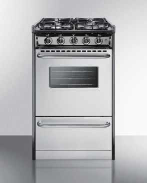 The compact 20-Inch Slide-In Gas Range from Summit Appliance features four sealed 9,000 BTU burners, a 2.5-cubit-foot oven cavity, and a broiler drawer, all in a scaled down width. The oven includes a window and interior light for easy monitoring while cooking, push-to-turn knobs, electronic ignition, and removable burner caps for easy cleaning. The oven is available in a stainless steel finish.
