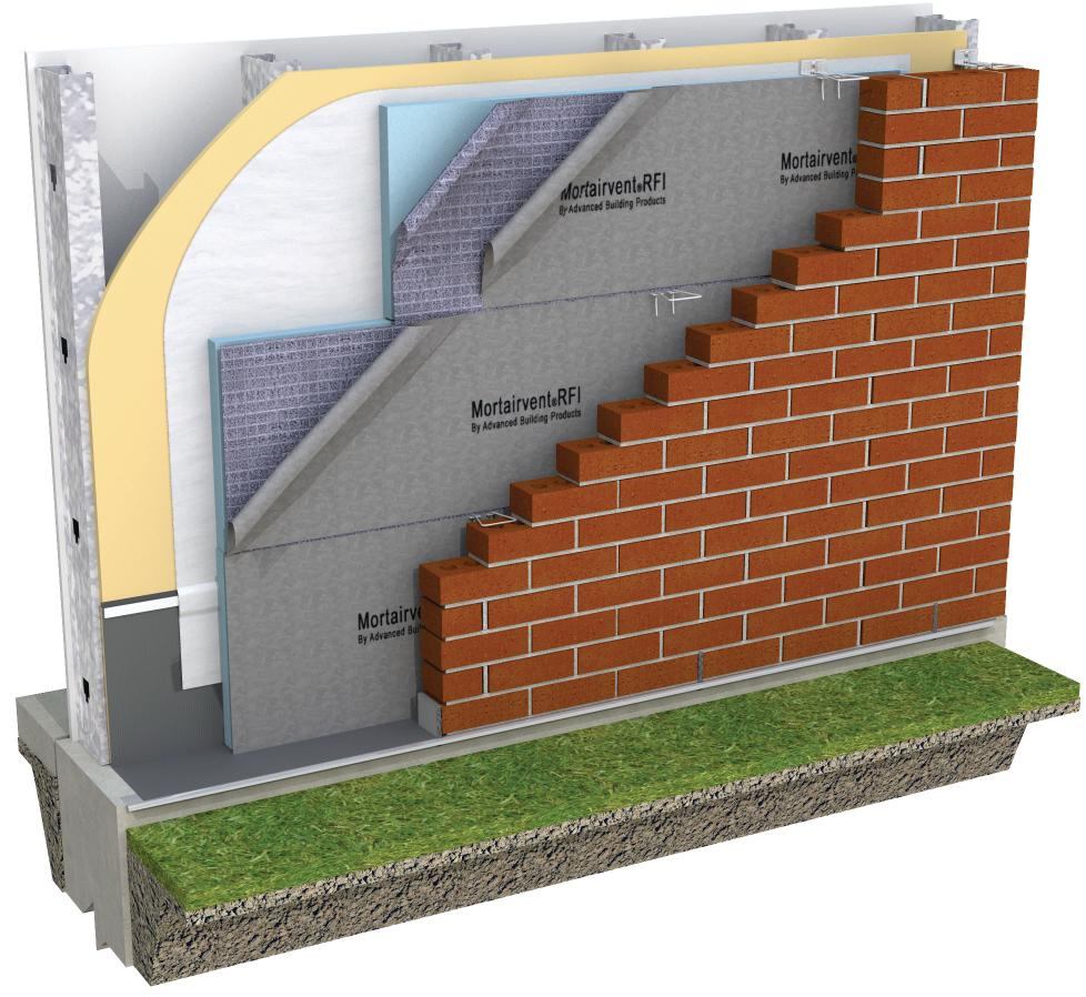 Intended for masonry cavity wall installations with stucco, stone, and brick veneers, Mortairvent RFI is made from the manufacturer’s non-woven, mortar deflection fabric adhered to rigid foam insulation panels. The 16-inch-width product—available in several thicknesses—is fitted between the brick ties in full cavity wall applications and allows the space to breathe and stay dry. Advanced Building Products, 800.252.2306; http://www.mortairvent.com/.