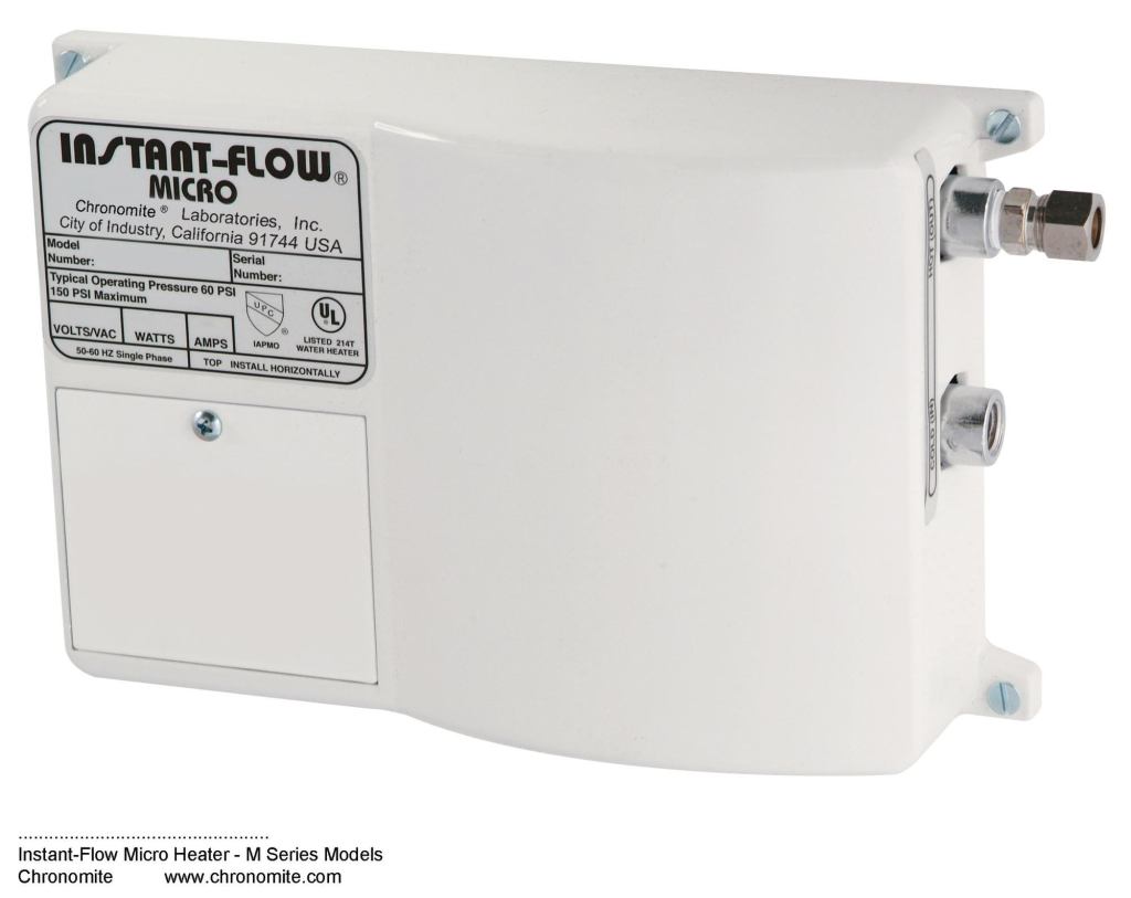 The Instant-Flow SR is an electric mini tankless water heater for point-of-use applications. Available for a wide variety of uses, the unit is 99 percent energy efficient and its small size makes it very versatile. It meets ADA requirements, delivers unlimited hot water, and can be used for bath lavatories, sinks, and showers. Cost: $350 to $450. Chronomite Laboratories. 800-447-4962. www.chronomite.com.