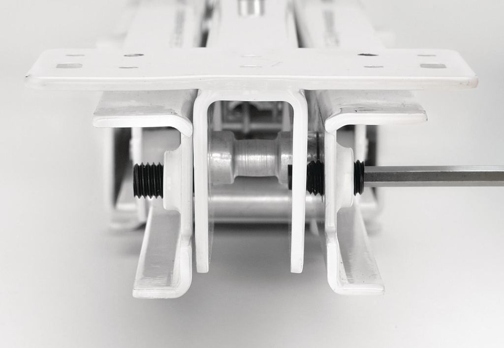 Using a hex wrench, installers can turn adjustment screws to center the pantry and adjust the tilt without changing the door height.