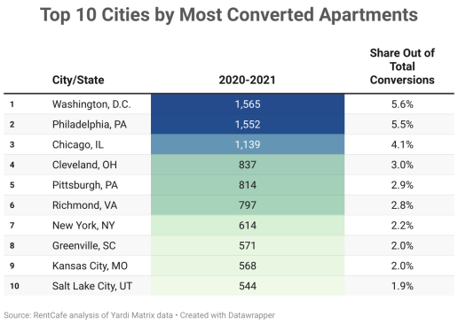 The top 10 cities by most converted apartments also includes: Cleveland; Pittsburgh; Richmond, Virginia; New York City; Greenville, South Carolina; Kansas City, Missouri; and Salt Lake City.