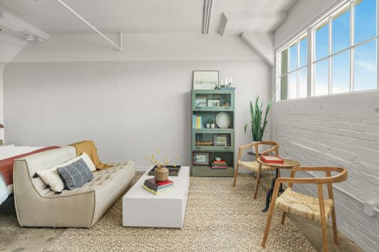 Originally built in 1918, the four-story building features industrial architecture with exposed brick walls, concrete floors, historically replicated steel-frame windows, and original mushroom columns. Each 1940s-inspired unit includes cream cabinetry, bronze hardware, glazed porcelain tile, and open shelving. Loft ceilings, carpentry closets, American-made light fixtures, and standing desks complete the units.